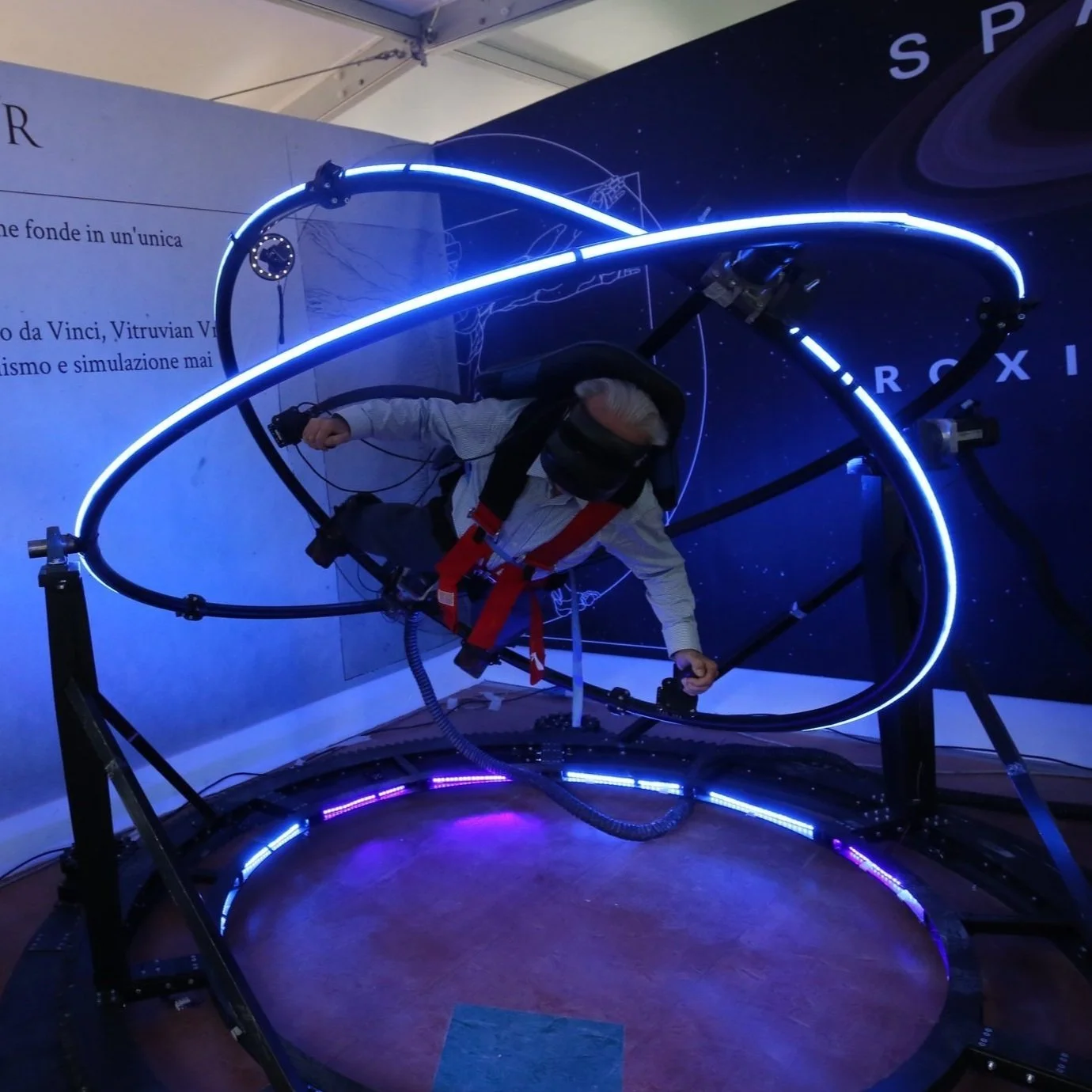 Vitruvian VR è un simulatore giroscopico a 4 assi in realtà virtuale con hardware e software innovativi. Con la macchina gli utenti possono sperimentare molteplici esperienze al momento non possibili sui simulatori a 3 assi.